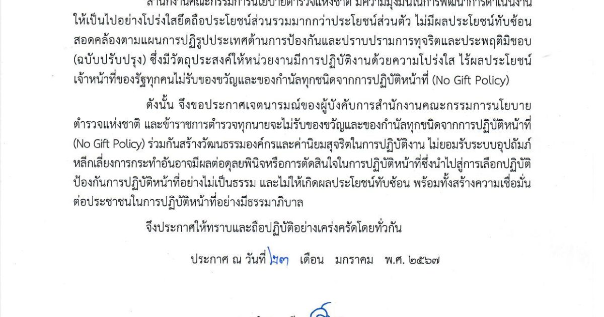 ประกาศสำนักงานคณะกรรมการนโยบายตำรวจแห่งชาติ เรื่อง เจตนารมณ์ที่จะไม่รับของขวัญหรือของกำนัลทุกชนิดจากการปฏิบัติหน้าที่ (No Gift Policy)