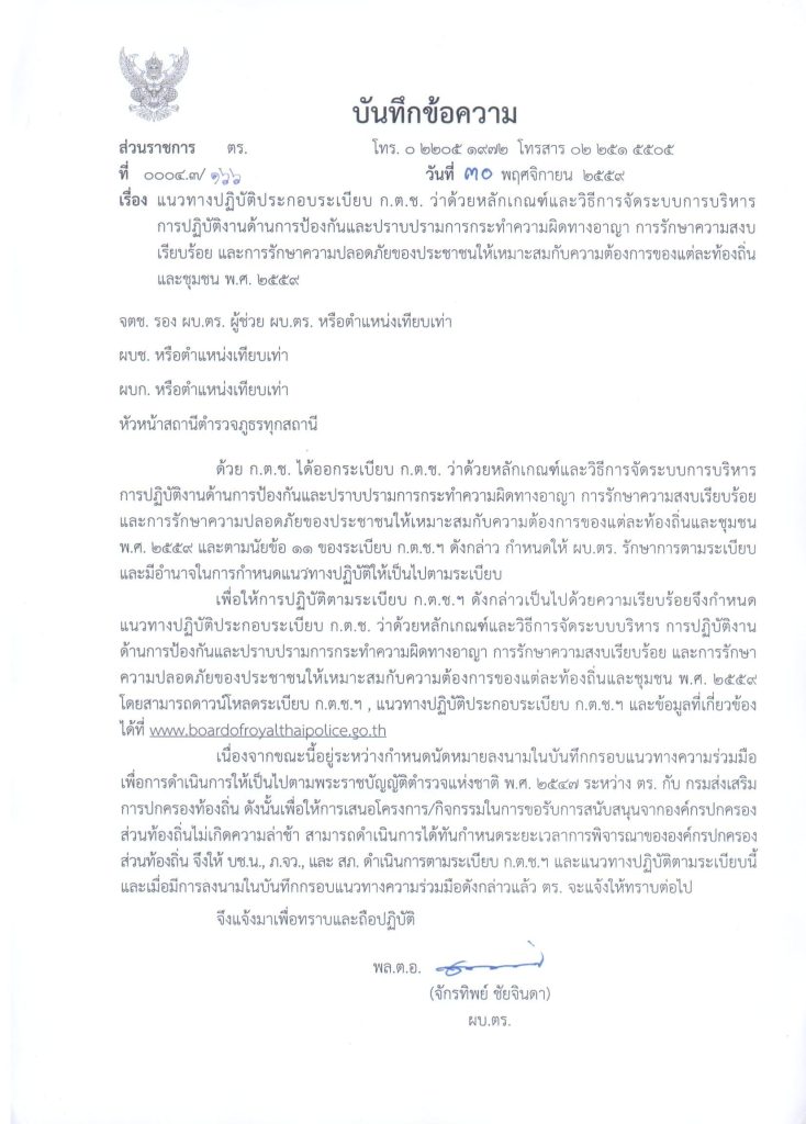 | แนวทางการปฏิบัติประกอบระเบียบ ก.ต.ช. ว่าด้วยหลักเกณฑ์และวิธีการจัดระบบการบริหารการปฏิบัติงานด้านการป้องกันและปราบปรามการกระทำความผิดทางอาญา การรักษาความสงบเรียบร้อย และการรักษาความปลอดภัยของประชาชนให้เหมาะสมกับความต้องการของแต่ละท้องถิ่นและชุมชน พ.ศ.2559 |
