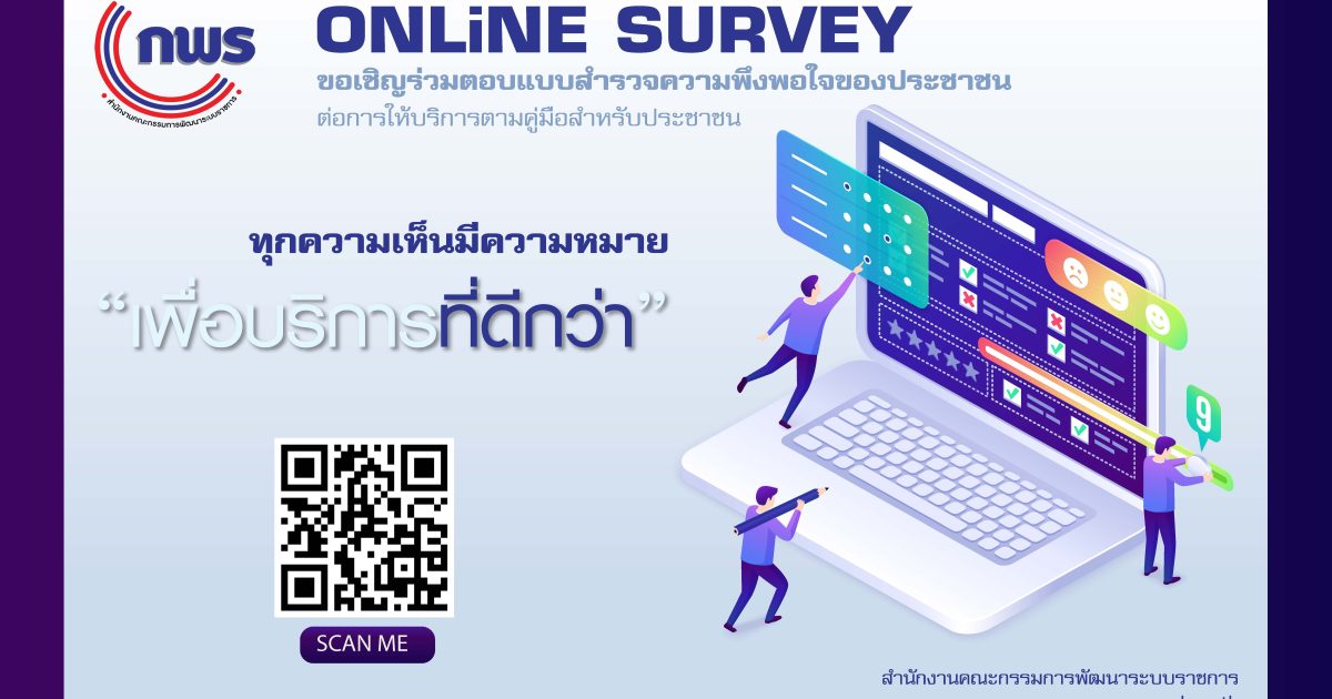สำนักงาน ก.พ.ร. ขอเชิญร่วมตอบแบบสำรวจความพึงพอใจของประชาชนต่อการให้บริการของหน่วยงานของรัฐ ปี พ.ศ.2565 เพื่อประโยชน์ในการพัฒนาบริการภาครัฐและอำนวยความสะดวกแก่ประชาชนได้ที่ลิงก์ https://opdc22.bitco.ltd/ หรือแสกน QR code ที่ปรากฏด้านล่าง #ทุกความเห็นมีความหมาย #อำนวยความสะดวก #betterservice