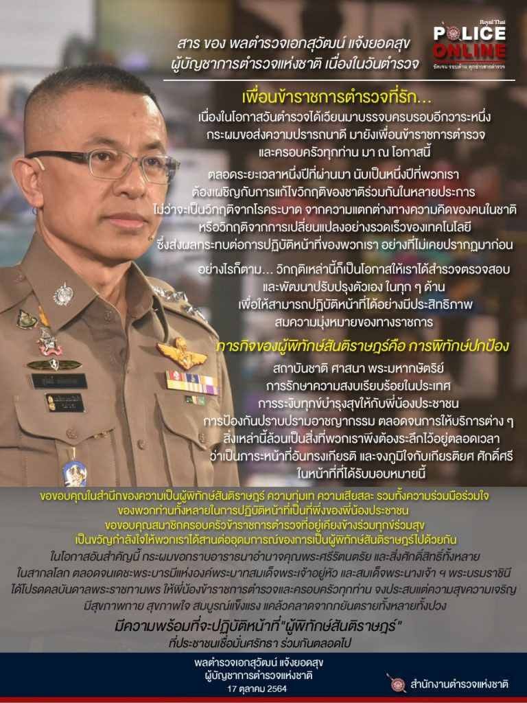 สาร ของ พลตำรวจเอกสุวัฒน์ แจ้งยอดสุข ผู้บัญชาการตำรวจแห่งชาติ เนื่องในวันตำรวจ เพื่อนข้าราชการตำรวจท